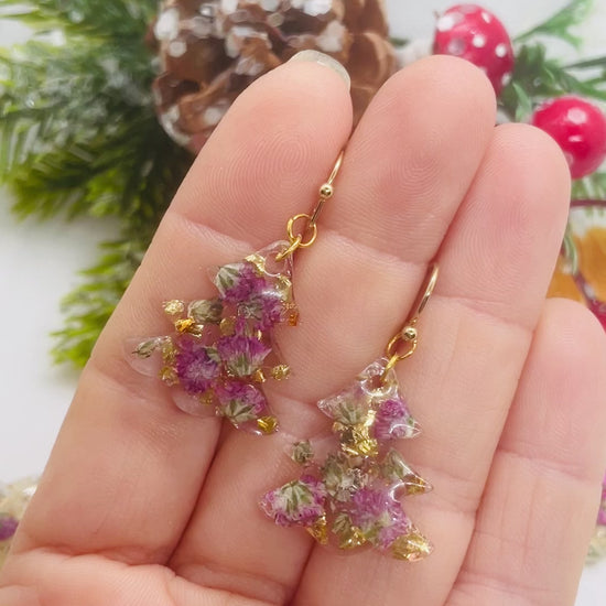 Gold and purple Christmas tree earrings
