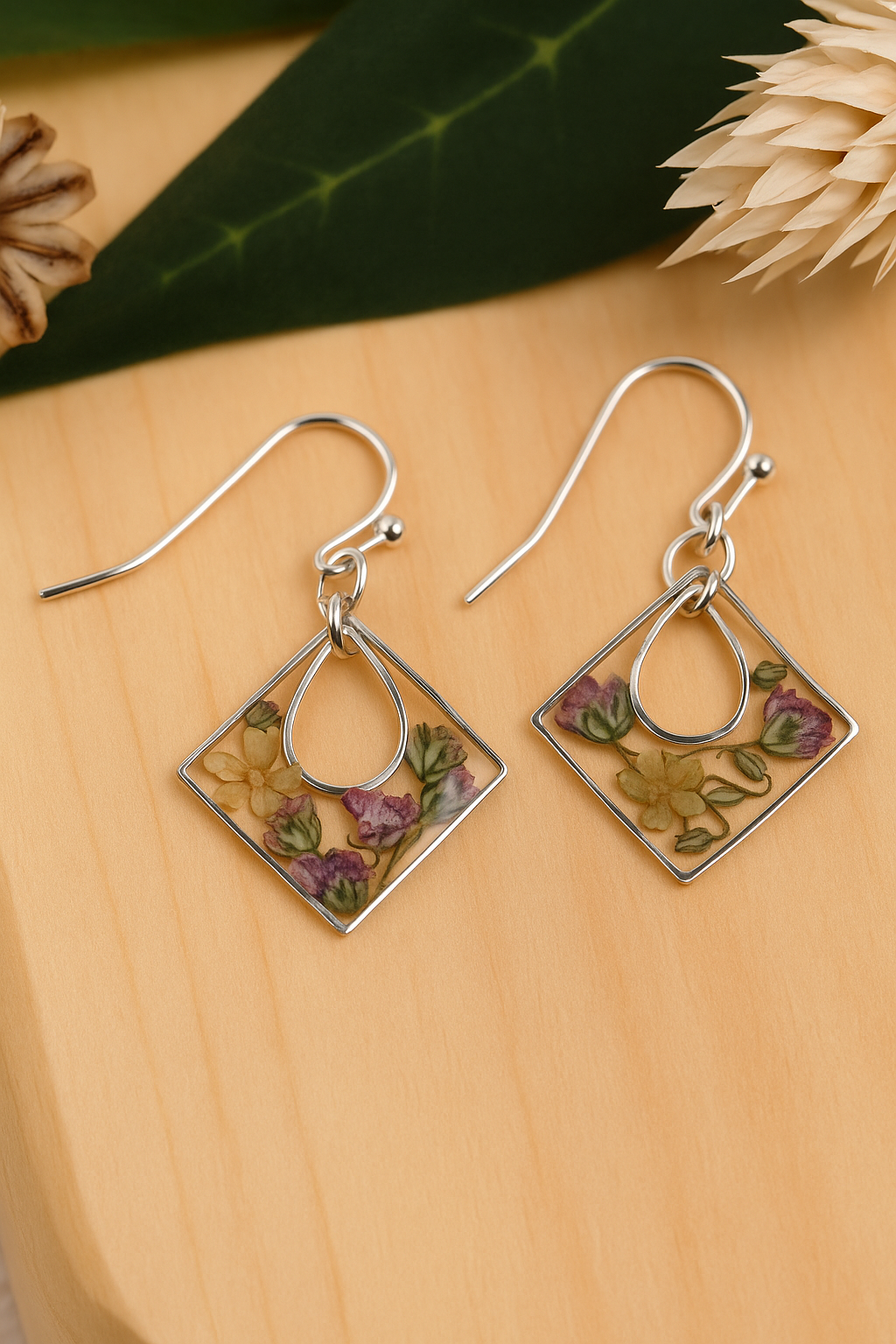 Delicate and timeless, these handmade earrings showcase the natural beauty of real dried flowers, thoughtfully preserved in crystal-clear resin. Every flower is hand picked from either my garden or the Dorset hedgerow, and then pressed in traditional Victorian style flower-presses.