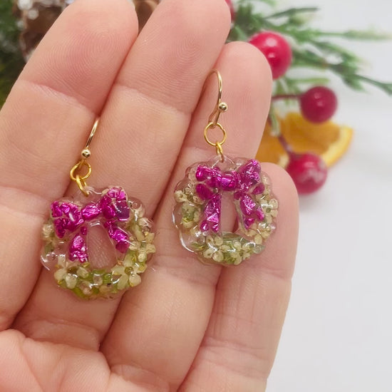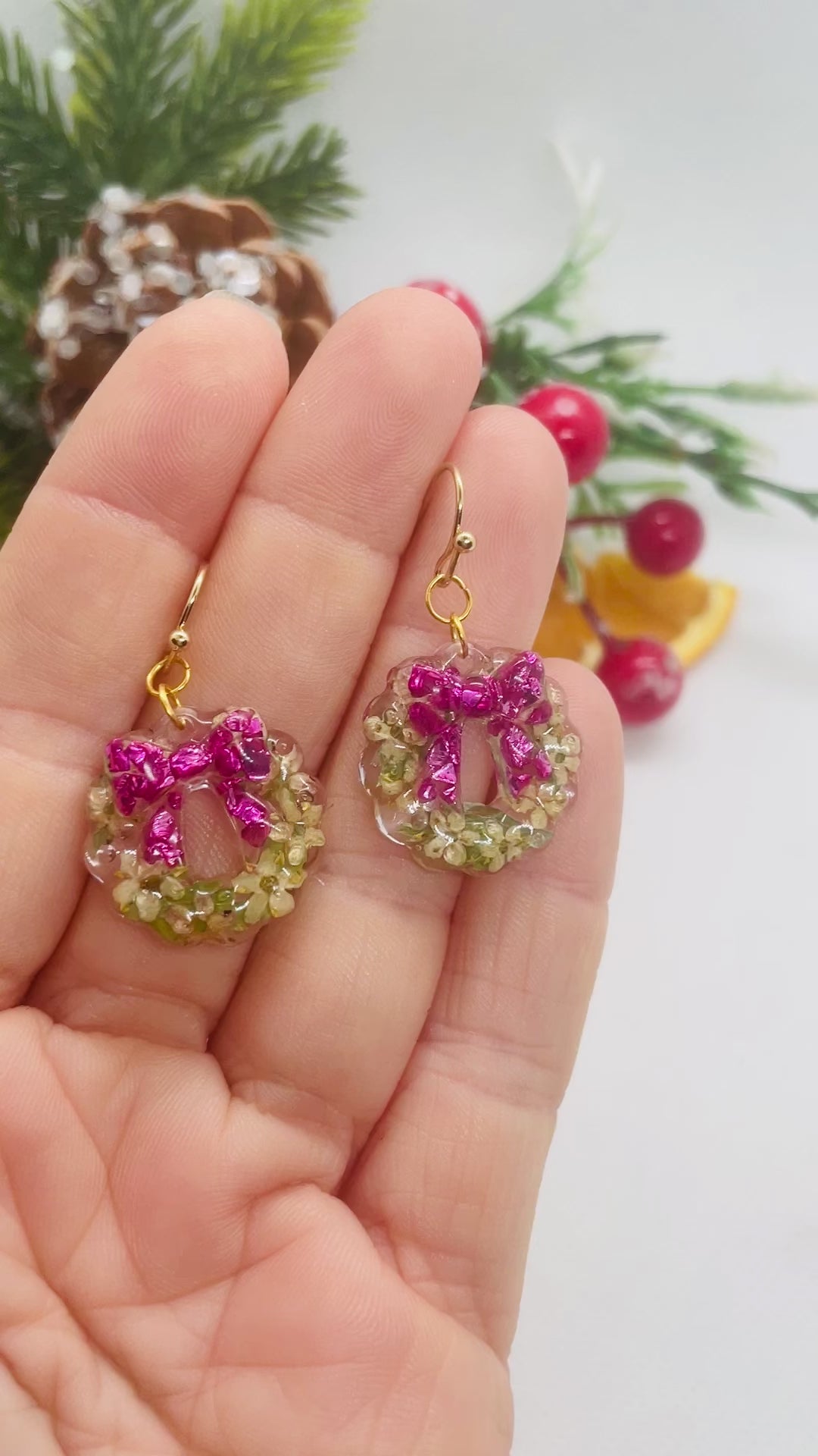 Tiny wreaths filled with dried green leaves, and shards of bright pink glass, these are a perfect festive pop!