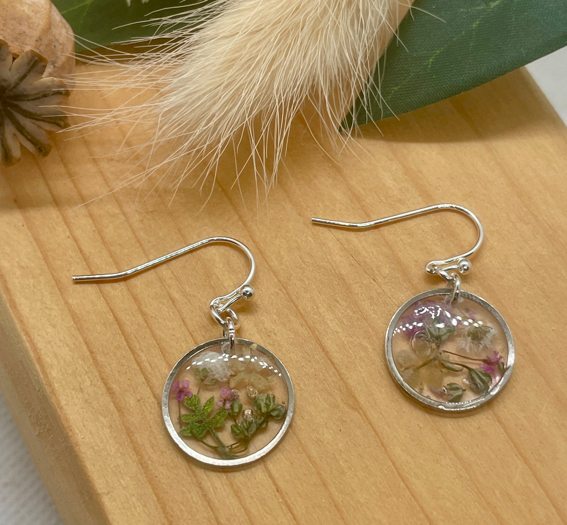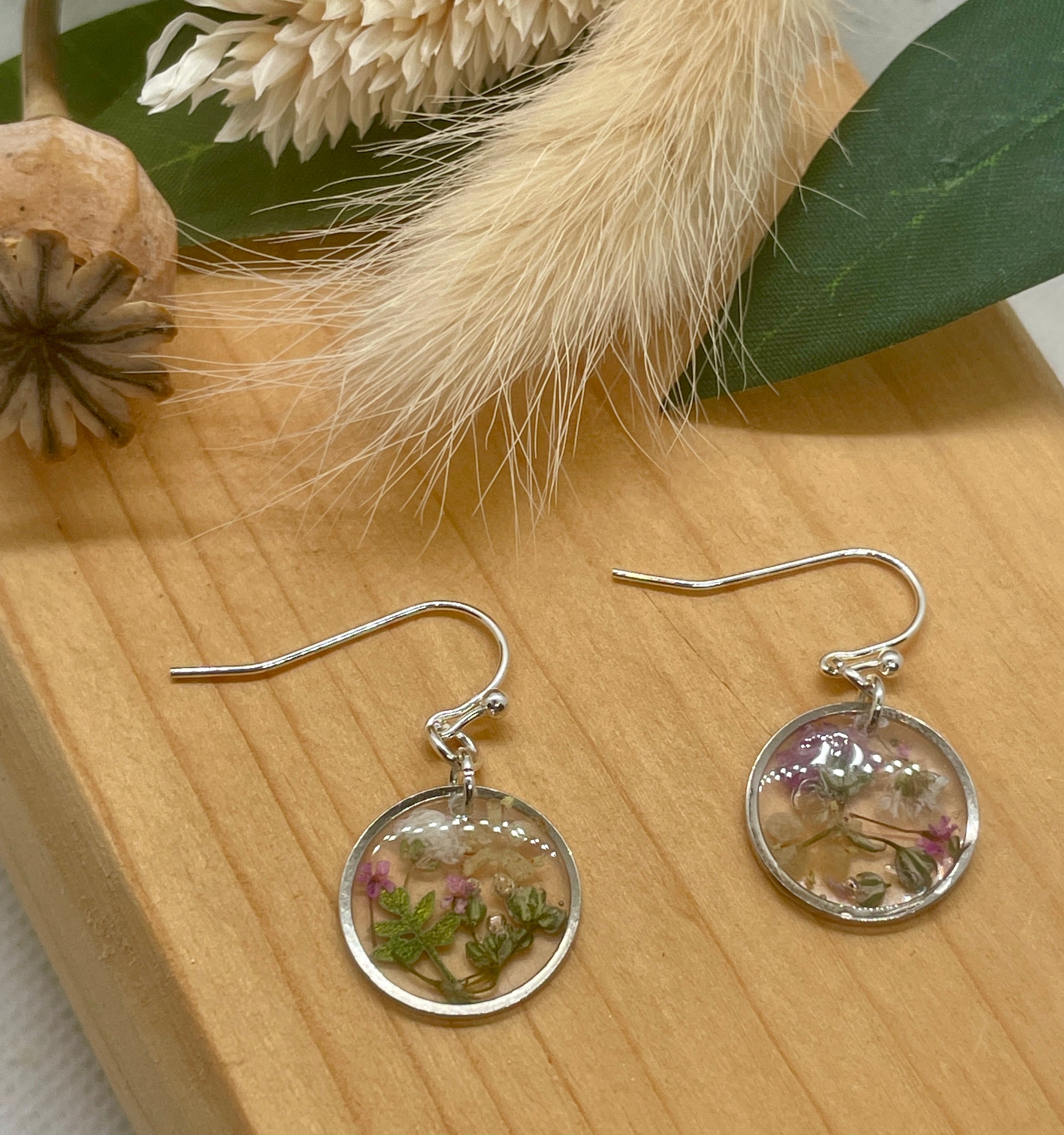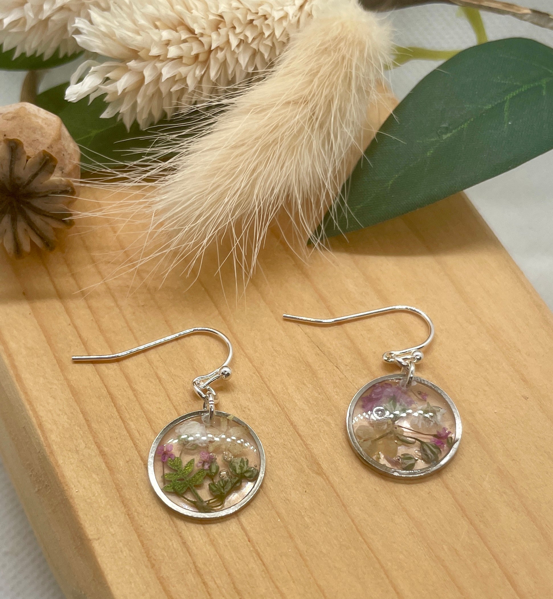 Set on silver plated earring hooks, filled with tiny flowers from my Dorset garden