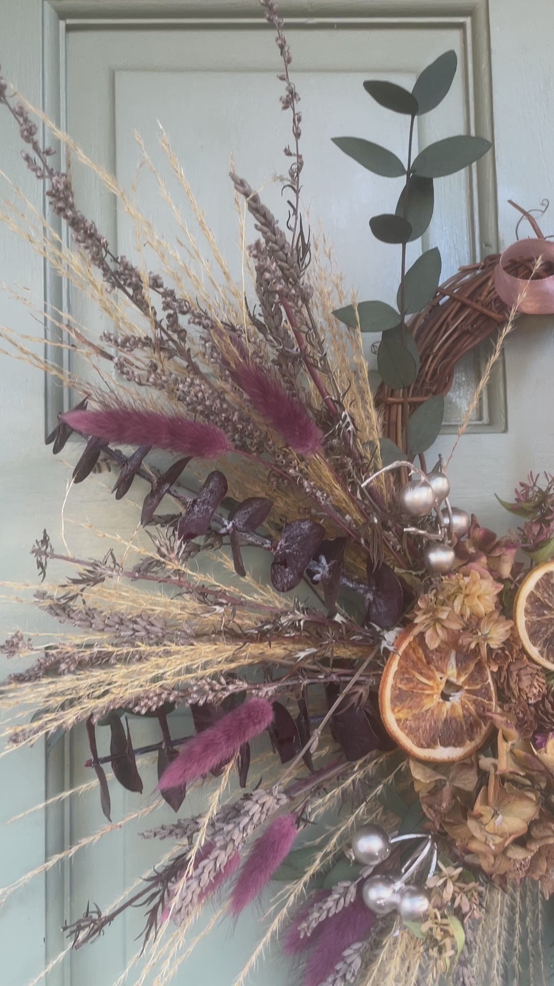 Bring timeless beauty into your home with this handcrafted wreath, lovingly made in the heart of rural Dorset. Bursting with dried flowers and grasses, and festive accents, this will be the perfect wreath to adorn your home year after year.