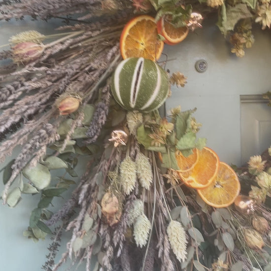 Bring timeless beauty into your home with this handcrafted wreath, lovingly made in the heart of rural Dorset. Bursting with dried flowers and grasses, and festive accents, this will be the perfect wreath to adorn your home year after year.